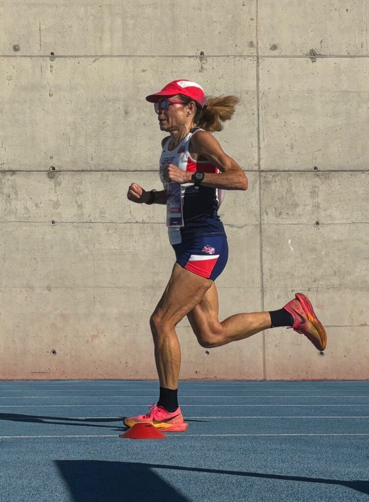 Diane Brian won W70 silver in the 5000m walk with 31:27.44 behind France’s Janine Vignat (30:11.38).